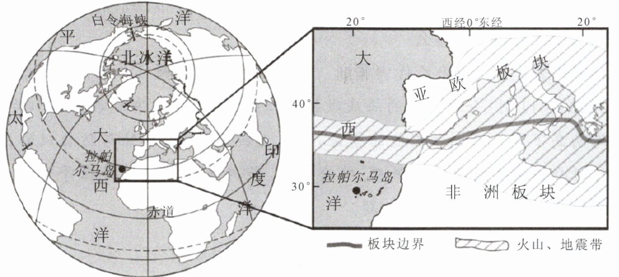 西班牙拉帕尔马岛火山于当地时间 2021 年 9 月 19 日开始喷发。喷发出的岩浆流入大洋冷却生成陆地,令这座岛的面积持续增大。该岛有记录以来曾发生过多次火山喷发。左图为陆半球示意图,右图为拉帕尔马岛位置示意图。读图,完成 11—14 题。
