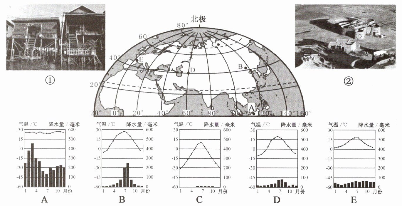 (填“①”/“②”)。(3)B、D、E三地中,年降水量最少的是