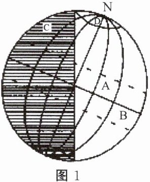 1. 在图中相应位置画出地球自转的方向。