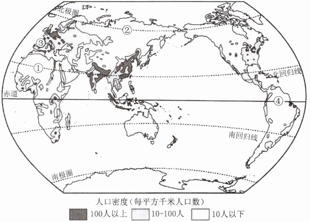 9. 图中①②③④四地中,属于人口稠密区的是(