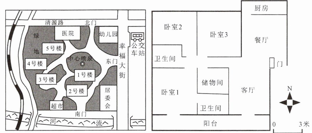 钱敏的家人新购了下图所示小区1号楼的一套房屋,他用小区地图和房屋户型图给爷爷奶奶介绍房屋的情况。读图,完成9—10题。