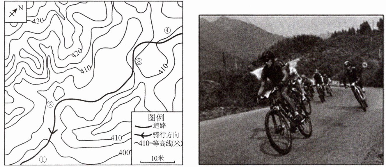 定向越野要求参赛者依次沿若干检查点前进,用最短时间到达终点。左图为赛道及月边地区地形图,右图为某自行车越野赛照片,据此完成11—13题。