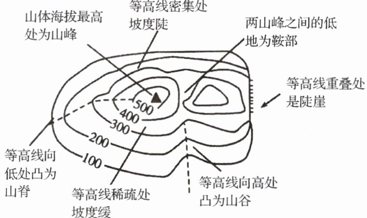 和陡崖等常见的山体地形部位。①山峰:等高线