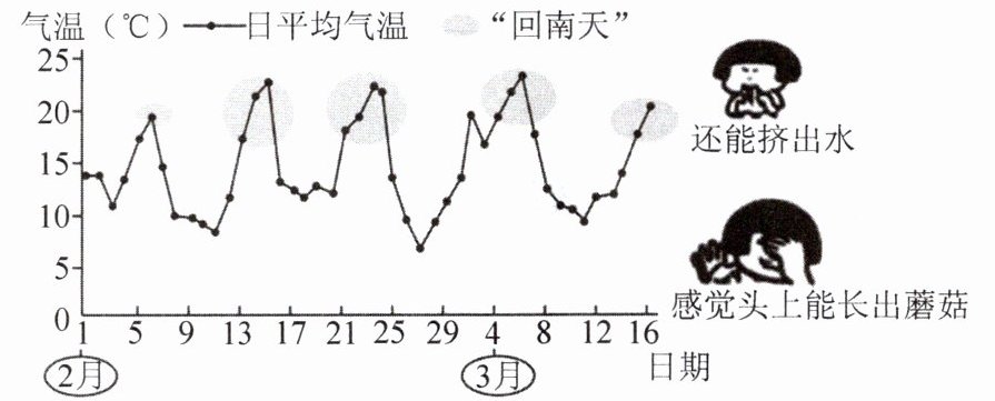 “回南天”是一种天气现象,人们会感觉到空气特别潮湿。下图为某城市“回南天”出现时气温变化图。读图,完成1—2题。!