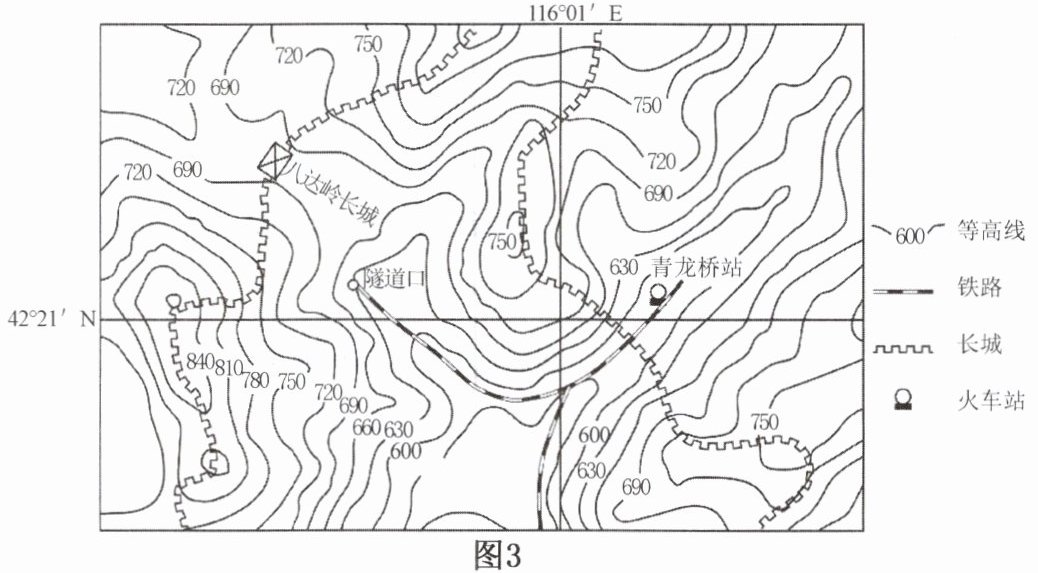 京张铁路是第一条完全由中国人自己设计建造的铁路,其“人”字形的设计彰显了中国人的智慧。图3为京张铁路示意图,完成9—10题。