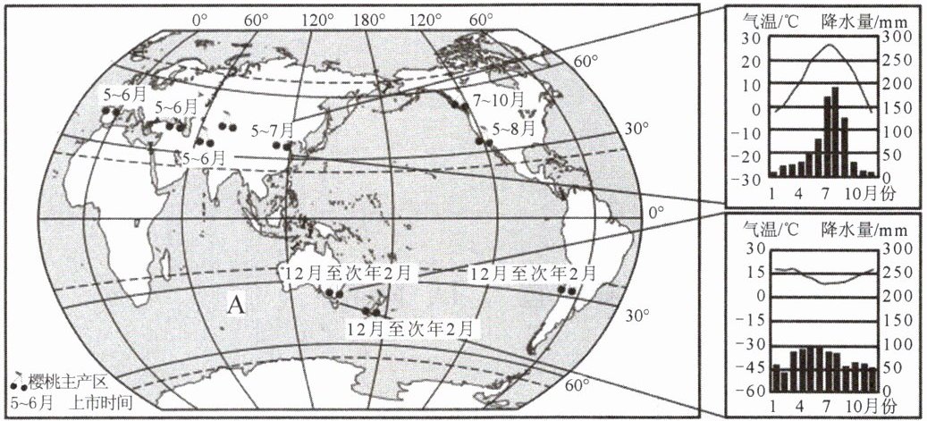 近年来,樱桃逐渐成为我国春节期间的“网红”水果。读世界樱桃主产区分布和上市时间图、气候资料图,完成下列各题。