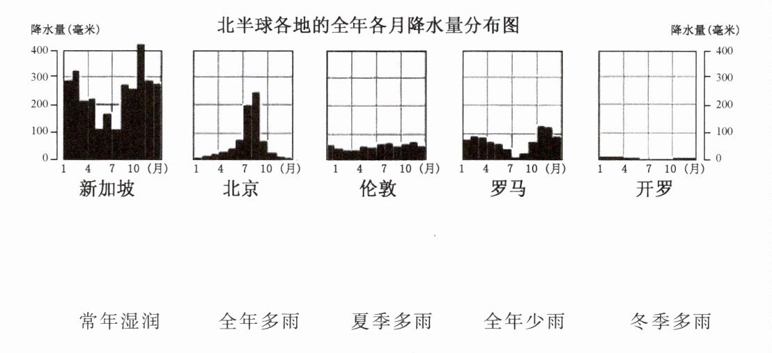 读下图,试将各类型所属城市名称和降水分配特点进行连线。