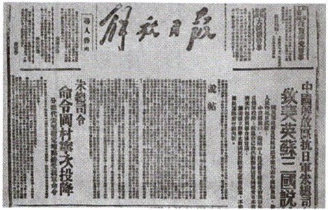 10. 新闻稿《朱总司令命令冈村宁次投降》:“冈村宁次将军:一、日本政府已正式接受波茨坦宣言条款宣布投降……”该新闻发表于 (