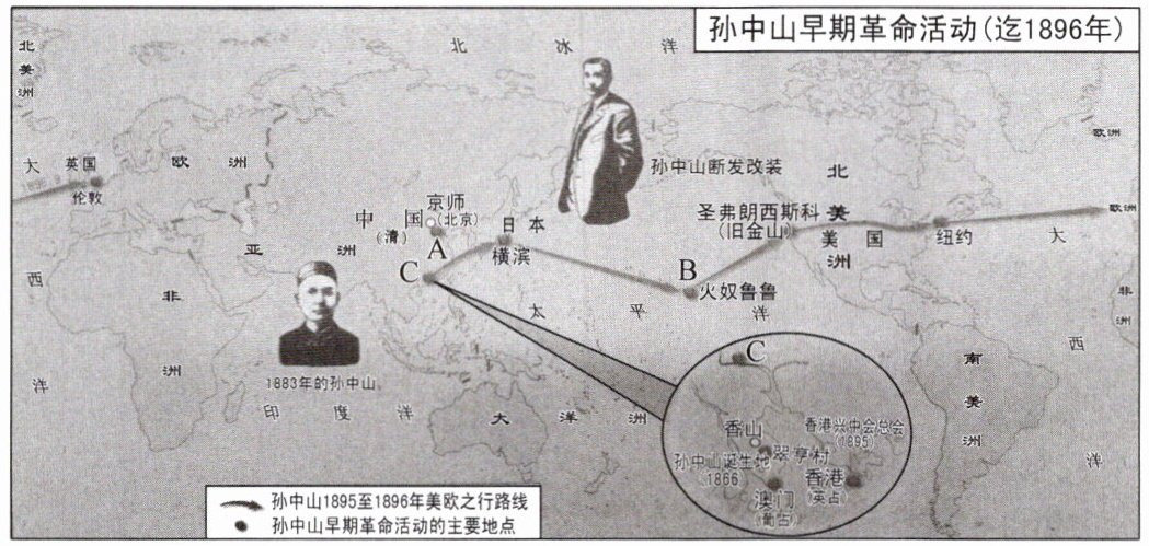 请结合孙中山的革命活动,写出图中ABC三地的地名。