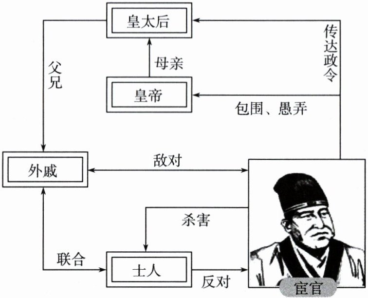 (1)东汉中期以后;外戚和宦官交替专权。(4分)皇帝早逝,继位的皇帝大多年幼,太后主政,重用外戚,导致外戚专权。皇帝长大后,利用身边的宦官设法除掉外戚,宦官由此得到宠信,把持朝政。如此反复循环,形成了外戚宦官交替专权的局面。(4分)