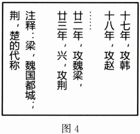 11. 《编年纪》是睡虎地发现的秦简之一(图4),书写时间为秦王政二十四年(公元前223年)。它以年份为线索,完整地记录了主人公“喜”的一生。根据图4所示秦简记录内容,“喜”参加的战争
