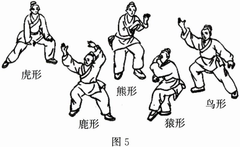 18. “五禽戏”(图5)是中医学的重要成果,具有很强的健身功效和文化价值。2003年,被列为国家级非物质文化遗产。“五禽戏”的创编者还(