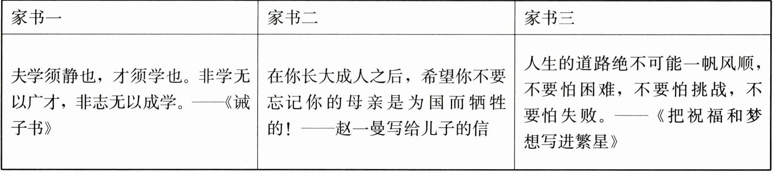(1)家书一:要努力学习,树立志向,保持潜心静学的态度。家书二:要热爱祖国,维护国家利益。家书三:直面挫折,要有面对困难的勇气和坚强的意志。
