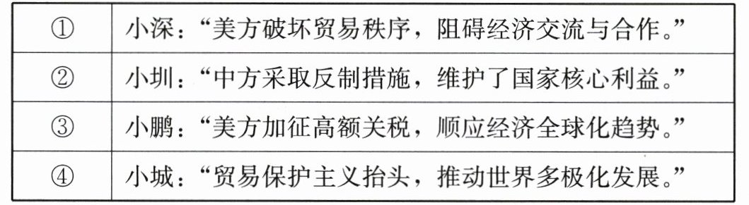 14. 在《道德与法治》课上,老师组织同学们开展“中美贸易动态”主题讨论活动。小明分享了一则新闻:美国政府多次对中国输美商品加征高额关税,中方已采取相应关税反制措施。同学们针对这一现象展开热烈讨论,以下观点正确的有(