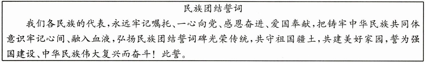 (2)①“各民族的代表,永远牢记嘱托、一心向党”,表明坚持中国共产党的领导是实现民族团结的根本保障,只有在党的领导下,各民族才能团结一心,共同奋斗。②“把铸牢中华民族共同体意识牢记心间、融入血液”,强调了铸牢中华民族共同体意识是加强民族团结的核心内容,它能使各民族在思想上和情感上更加紧密地联系在一起。③“共守祖国疆土,共建美好家园,誓为强国建设、中华民族伟大复兴而奋斗”,表达了各民族团结一致,共同维护国家领土完整,积极投身国家建设,为实现中华民族伟大复兴的中国梦贡献力量的坚定决心。