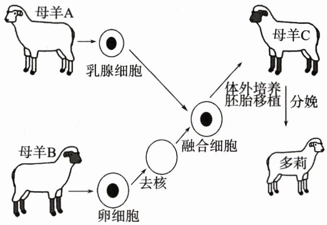 1996年,英国科学家首次用母羊体细胞成功克隆出小母羊,小羊取名多莉。克隆羊多莉的产生过程如下:将母羊A的乳腺细胞移入母羊B的去核卵细胞中,将融合细胞形成的胚胎植入母羊C的子宫内,胚胎在子宫内发育成熟后产出,这就是克隆羊多莉。