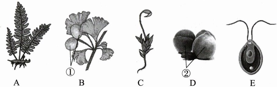 27. (12分)某生物调查小组对如图几类生物进行了观察和记录,请利用你所学的生物学知识帮他们完成记录和分析。如图是五种不同生物的形态结构示意图,A是肾蕨、B是银杏、C是葫芦藓、D是桃、E是衣藻。请分析并回答相关问题: