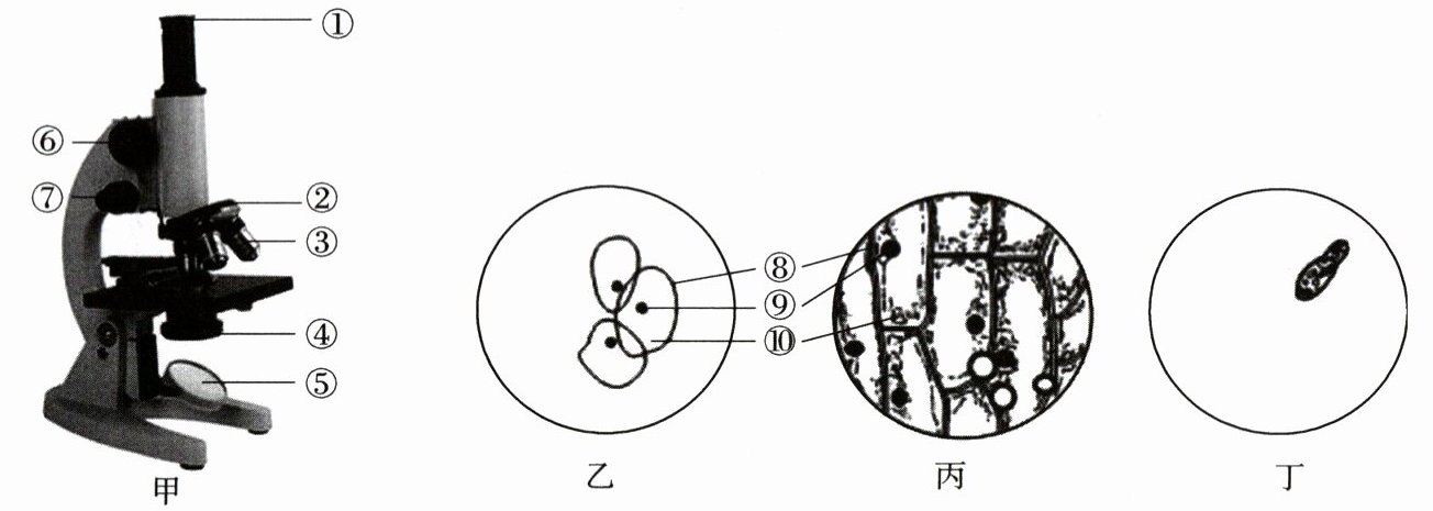 27. (6分)如图甲为光学显微镜结构图,图乙、丙、丁分别为显微镜下观察的人的口腔上皮细胞、洋葱鳞片叶内表皮细胞、草履虫。请据图分析回答下列问题: