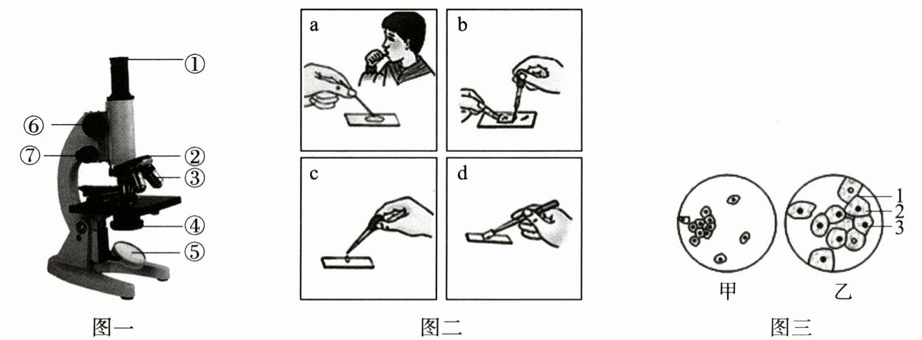 28. (7分)如图一是显微镜的结构,图二是某同学制作“人的口腔上皮细胞”临时装片的部分步骤,图三是显微镜下观察到的不同视野。据图分析回答问题: