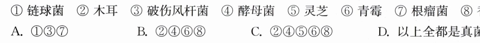 ① 链球菌 ② 木耳 ③ 破伤风杆菌 ④ 酵母菌 ⑤ 灵芝 ⑥ 青霉 ⑦ 根瘤菌 ⑧ 香菇