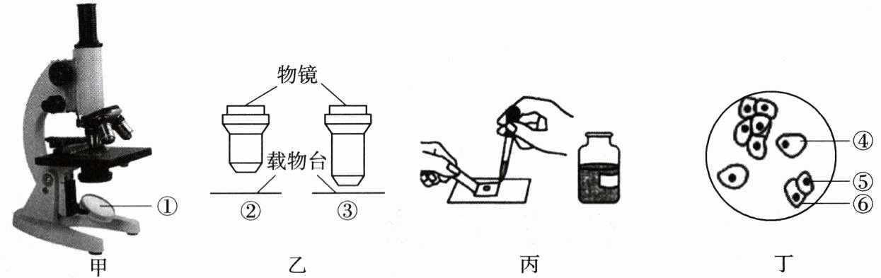 10. 某位同学制作并观察人的口腔上皮细胞临时装片时,进行了下列部分操作,并在显微镜下观察到丁图物像。有关叙述不正确的是(