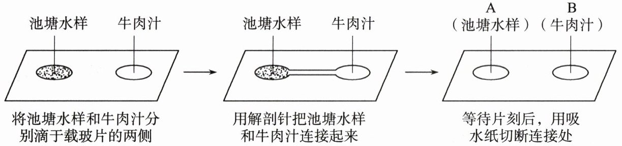 的特征。将池塘水样和牛肉汁分别滴于载玻片的两侧