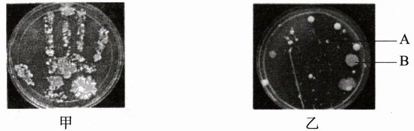 31. (6分)图甲、乙分别是晓敏同学用手在高温灭菌后的固体培养基上轻轻按一下和将一个高温灭菌后的固体培养基在空气中暴露5分钟后,盖上盖进行恒温培养后拍摄的照片。请据图回答问题: