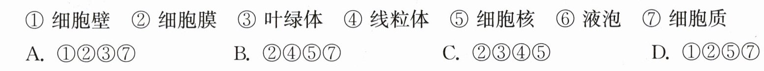 )① 细胞壁 ② 细胞膜 ③ 叶绿体 ④ 线粒体 ⑤ 细胞核 ⑥ 液泡 ⑦ 细胞质