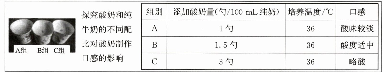 (3)结果分析:乙同学在制作酸奶的同时还进行了探究活动,A、B、C组酸奶测定的pH分别是6、5、4(数值越小,酸度越高),C组酸奶pH最低,可见,在一定范围内,随着酸奶的配比增多,