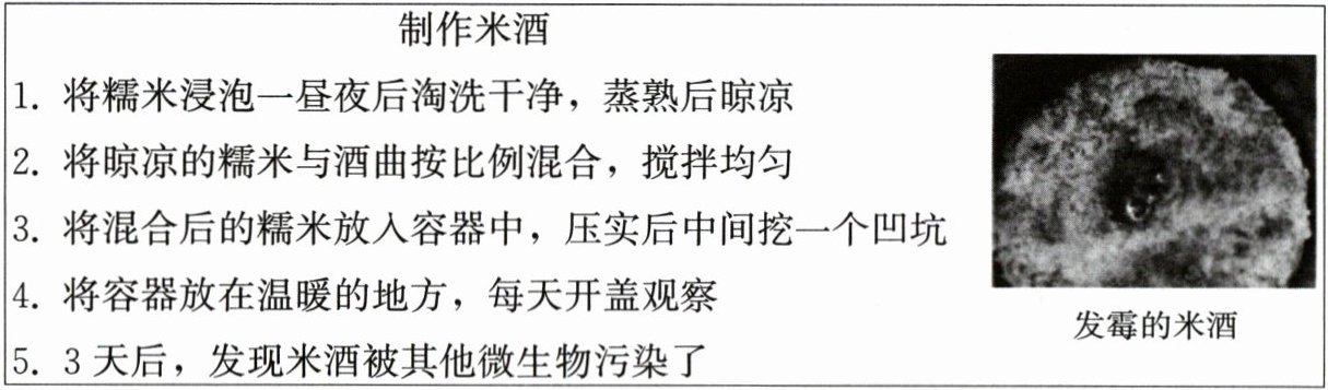 。丙同学制作的米酒被污染了,请结合其制作过程推测可能的原因是每天开盖观察,杂菌污染了容器