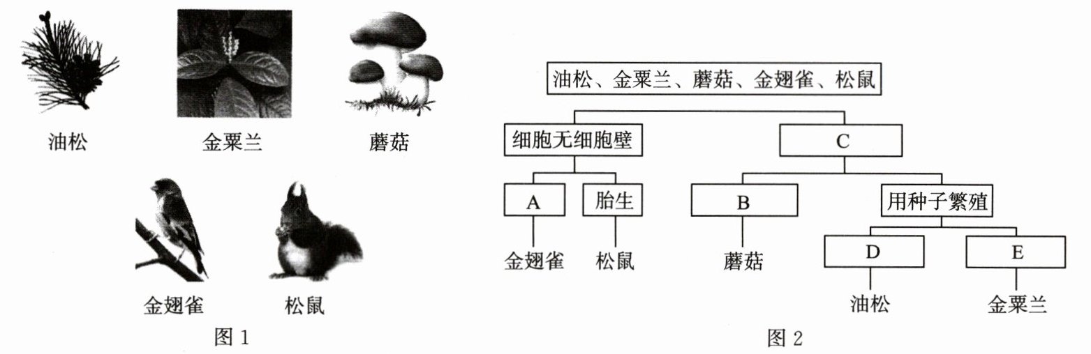 资料二:生物研学小组成员将在一景区内观察到的五种生物(图1),按照一定的特征进行了分类(图2)。