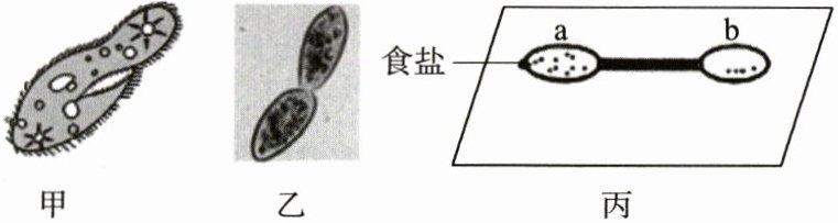 11. 兴趣小组的同学在池塘中采集到草履虫,并对草履虫进行了培养和观察。下图中甲是草履虫的结构示意图,乙是草履虫的繁殖方式,丙是探究草履虫对外界刺激的反应。下列相关叙述中,错误的是(