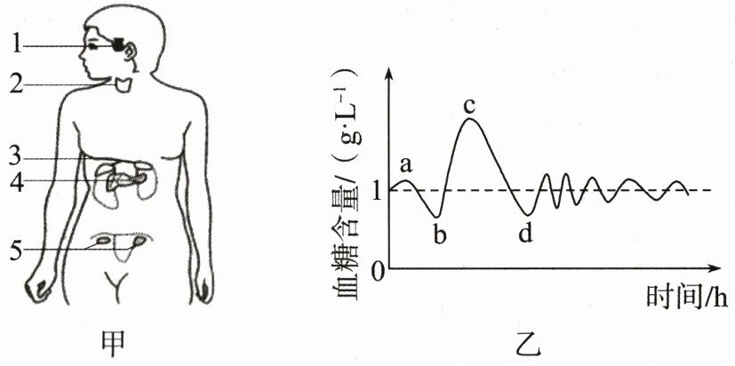 (5)下山后饱餐一顿,测得血糖含量变化情况如图乙所示。图乙中cd段血糖含量大幅下降与[