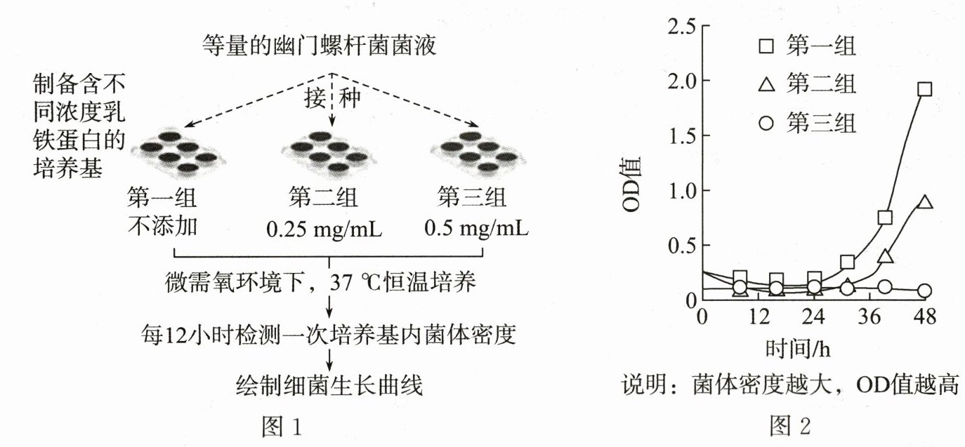 。(4)乳铁蛋白具有广谱抗菌、抗癌、调节免疫系统功能等作用。研究人员通过实验探讨乳铁蛋白对Hp生长繁殖的影响,实验流程和结果如下。
