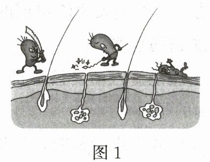 (1)环境中众多的病原体不易伤害我们,首先是因为我们的皮肤具有保护功能,能抵挡病原体的侵人,图1和