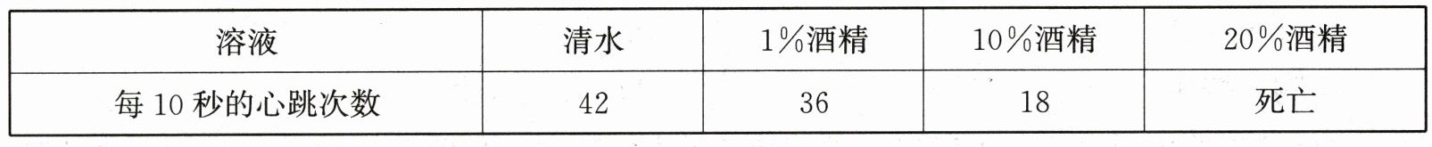 19. 为探究不同浓度的酒精对水蚤心率的影响,生物小组进行了相关实验,实验结果见下表,下列相关叙述正确的是(