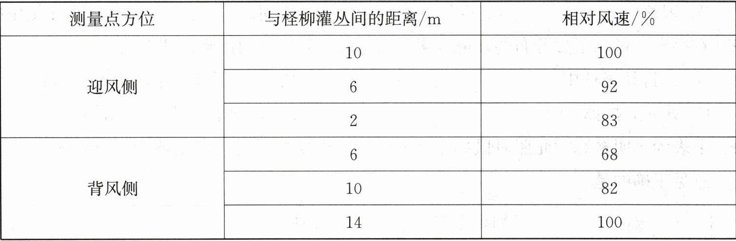 ,起到了良好的防风固沙作用。(3)研究人员对柽柳防风固沙功能进行野外观测,结果如下表。