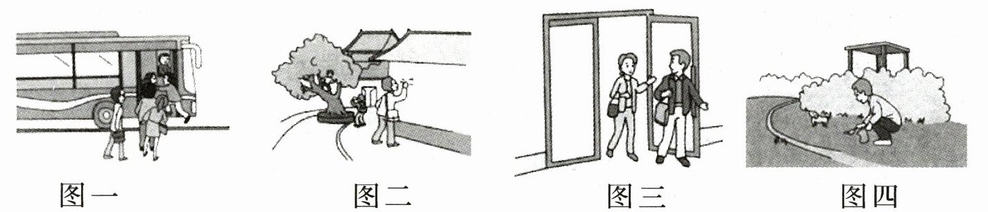 为了抢着上车推搡争吵 不仅耽误他人行程,还容易发生事故 在景点为了拍照,攀爬树木;在墙上乱写乱画 注意形象,文明旅游,保持景点干净整洁 随地吐痰,在公共场合大声喧哗 进门后帮他人扶着门,遛狗时及时清理垃圾