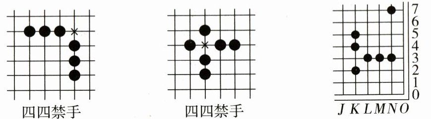 4. 下五子棋时,黑方一子落下同时形成两个或两个以上的四,这步棋就称为“四四禁手”(如下图所示)。如果要在下面右图的棋盘中形成“四四禁手”的棋局,那么下一步棋应该落在什么位置?这个位置用数对表示为(