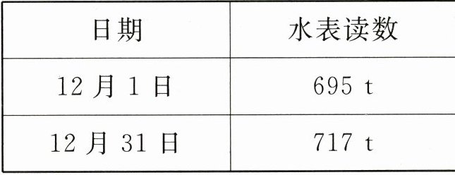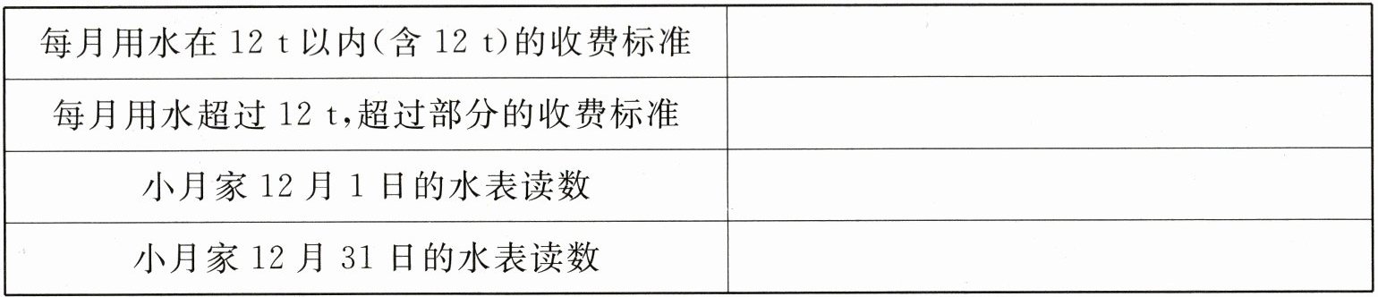 6. 某市为鼓励节约用水,规定每月用水$12$t以内(含$12$t)的,每吨收费$2.5$元;每月用水超过$12$t的部分,超过部分每吨收费$3.8$元。小月家12月份的水表读数如下表。(本月用水量=本月最后1天水表读数一本月第1天水表读数)(6分)