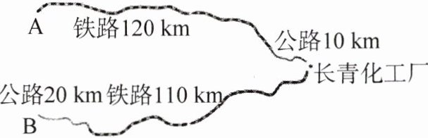 6. (应用意识、模型观念)如图,长青化工厂与A,B两地有公路、铁路相连。这家工厂从A地购买了一批每吨1000元的原料运回工厂,制成每吨8000元的产品运到B地。已知公路运价为1.5元/(吨·千米),铁路运价为1.2元/(吨·千米),且这两次运输共支出公路运输费15000元,铁路运输费97200元。