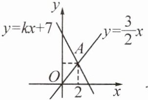 1. 如图,一次函数 $ y = \frac{3}{2}x $ 的图象与 $ y = kx + 7 $ 的图象相交于点 $ A $,则方程组 $\begin{cases}y = kx + 7,\\y = \frac{3}{2}x\end{cases}$ 的解是( )