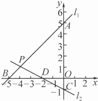 4. (模型观念)如图,直线 $ l_1:y = x + 5 $ 分别交 $ y $ 轴、$ x $ 轴于 $ A,B $ 两点,直线 $ l_2:y = -\frac{1}{2}x - 1 $ 分别交 $ y $ 轴、$ x $ 轴于 $ C,D $ 两点,直线 $ l_1,l_2 $ 相交于点 $ P $。