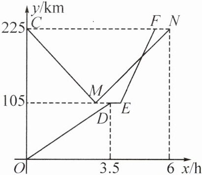 3. [2024·黑龙江]甲、乙两货车分别从相距 225km 的 A,B 两地同时出发,甲货车从 A 地出发途经配货站时,停下来卸货,半小时后继续驶往 B 地,乙货车沿同一条公路从 B 地驶往 A 地,但乙货车到达配货站时接到紧急任务立即原路原速返回 B 地,结果比甲货车晚半小时到达 B 地。如图是甲、乙两货车距 A 地的距离 y(单位:km)与行驶时间 x(单位:h)之间的函数图象,结合图象回答下列问题: