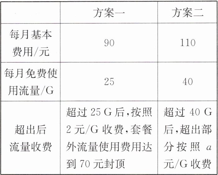 (2)在方案二中,当每月使用流量超过 40G 时,求每月所需费用 y 与每月使用流量 x 之间的函数表达式。