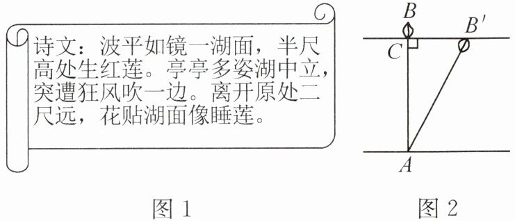 例3 [2024·吉林]图1中有一首古算诗,根据诗中的描述可以计算出红莲所在位置的湖水深度,其示意图如图2。其中AB=AB',AB⊥B'C于点C,BC=0.5尺,B'C=2尺。设AC的长度为x尺,可列方程为