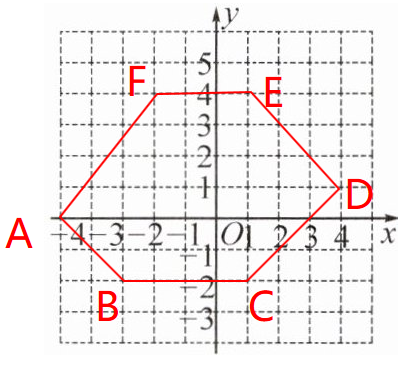 5. 六边形六个顶点的坐标分别为$A(-4,0)$,$B(-2,-2)$,$C(1,-2)$,$D(4,1)$,$E(1,4)$,$F(-2,4)$。