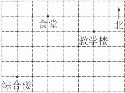 例3 [2024春·长沙期中]如图,这是一个利用平面直角坐标系画出的某学校的示意图,如果这个坐标系以正东方向为 $x$ 轴的正方向,以正北方向为 $y$ 轴的正方向,并且综合楼和教学楼的坐标分别是$(-4,-1)$和$(1,2)$,那么食堂的坐标是(