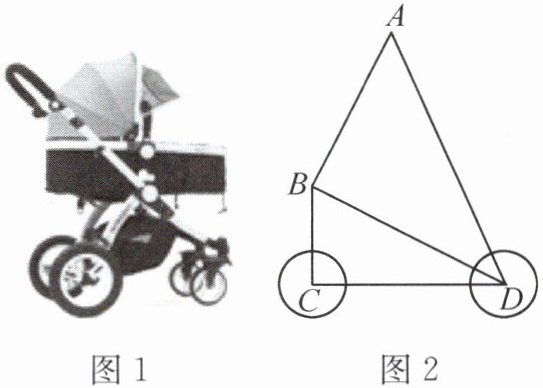 4. [2024·高唐县期末]图 1 是某品牌婴儿车,图 2 为其简化结构示意图。现测得 $AB = CD = 6\ dm$,$BC = 3\ dm$,$AD = 9\ dm$,其中 $AB$ 与 $BD$ 之间由一个固定为 $90^{\circ}$ 的零件连接(即 $\angle ABD = 90^{\circ}$),根据安全标准需满足 $BC\perp CD$,请通过计算说明该车是否符合安全标准。