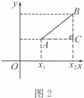 探究:如图2,$A(x_{1},y_{1})$,$B(x_{2},y_{2})$是平面直角坐标系中任意两点,过A,B两点分别向x轴、y轴作垂线,过点A垂直于y轴的直线与过点B垂直于x轴的直线相交于点C。